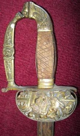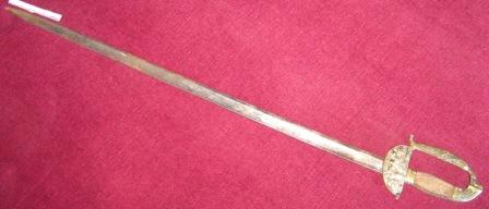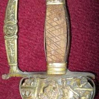 - Espada de cinxir con gardamán e gabiáns rectos con galluelo e concha volta carece de apliques nas cachas, talvez desprendidas; o filo, dunha mesa. Botón cunha flor e gardamán con motivos vexetais e animais e figurada dun Hermes.