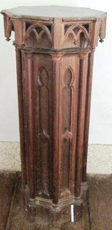 - Peaña en madeira de castiñeiro, tallada con motivos góticos de tracería, de planta octogonal.