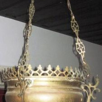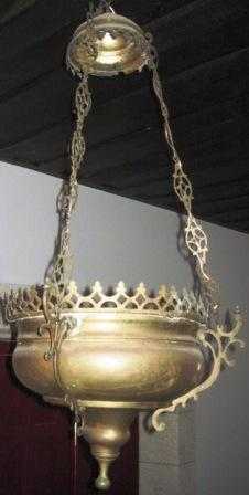 - Lámpada votiva de aceite, de teito, fundida en bronce, co seu prato en forma de campá invertida coroado por unha crestería calada, flordelisada. Vai suxeita con tres cadeas de elos calados. Conta con tres soportes de perfil acantiforme sobrepostos ao perfil do corpo para cadansúa candea.