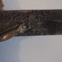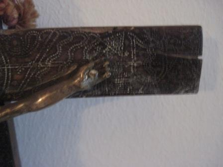 - Cruz en madeira formando debuxos, arabescos e aréola, con craviños en bronce. A cruz é simple e escadrada. O Crucificado, fundido en bronce, é de tres cravos.