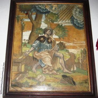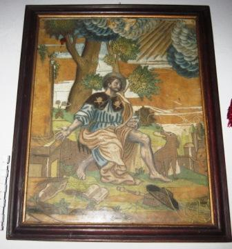 - Estampa sobre bordado que representa a imaxe de San Roque baixo a iconografía habitual, nun bosque, vestido de peregrino e acompañado do célebre can. Litografiado e bordado en fíos de seda sobre alma de cartón. Marco en madeira.