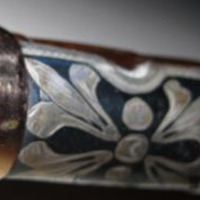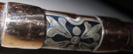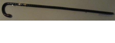- Bastón co vástago en madeira con dous apliques en metal bañado en ouro nas virolas. Entre elas, unha placa rectangular metálica, esmaltada en negro, con flores de lis prateadas en cadansúa esquina.