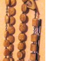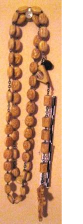 - Rosario en pasta beixe con todas as contas en relevo coa imaxe da Virxe; no reverso as letanías da Nosa Señora.