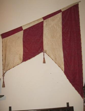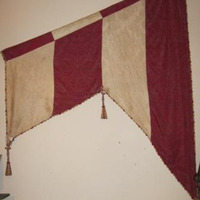 - Pendón relixioso realizado en damasco de seda natural con franxas en cor vermello e branco. Tres apliques en forma de borlas.