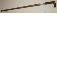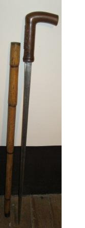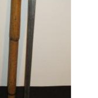 - Bastón con estoque. A funda ou estoxo vai tallada en madeira de bambú, o puño en madeira de castiñeiro, vai ornamentado na face cunha tarxa vexetal.