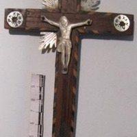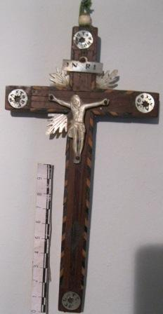 - Crucifixo relicario en madeira de oliveira con fileteados en marquetería. A cruz é simple, co titulus de rigor, e escadrada. Conta con catro discos en nácara nos cadrantes da cruz coa inscrición PASTOR DELATE TORSINA. Cun crucificado de tres cravos, sobreposto e en nácara, acompañado de catro ráfagas (perdeu unha delas) en nácara e o INRI (Iesus Nazarenus Rex Iudeorum); Este tipo de cruces procede dos Santos Lugares, de onde chegaron a Occidente como obxectos de recordo de peregrinación. Un dos factores de riqueza dos cristiáns en Palestina foi a industria ou artesanía de rosarios, cruces e toda clase de souvenires relixiosos dos Santos Lugares, fabricados con madeira de oliveira, nácara e outras materias, recordos propiciados polos franciscanos da Obra Pía de Xerusalén, institución benéfico-piadosa destinada á conservación, acrecentamento e restauración dos Santuarios de Terra Santa. Esta cruz responde ao exercicio piadoso de Vía Crucis, costume iniciada en Xerusalén da man dos franciscanos, recompensada dende o principio cun gran número de indulxencias. O Vía Crucis evocaba mediante catorce estacións ou etapas, o camiño percorrido por Cristo durante a Paixón. En 1773 o papa Clemente XIV concedeu as mesmas indulxencias ao rezo do Vía Crucis na casa, sempre que o devoto sostivese entre as súas mans unha cruz. De aí a multiplicación da produción de cruces adornadas con círculos de nácara alusivas ás estacións. Acrecentouse así mesmo a exportación ao Occidente.