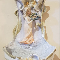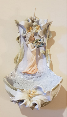 - Benditeira en cerámica de biscuit. Na placa, coa figura dun Neno Xesús que sostén unha coroa de flores. Coroa o conxunto un ramallete de azucenas, flores que tamén ornamentan a pía.