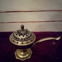 - Incensario en bronce. Tapadeira calada con landra de remate. Vai sobre un pé octogonal e dispón de mango rematado a modo de póla.