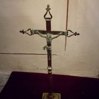- Crucifixo en bronce cun astil columnario de orde toscana sobre plinto en forma de campá e basamento cadrado. O Cristo é de tres cravos co perizonium anudado á esquerda. Os brazos da cruz, flordelisados e calados.