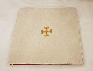 - Bolsa de corporais en seda natural adamascada de cor vermella con motivos florais e vexetais en fío de ouro, e ribeteado con pasamanería da mesma finta dourada.