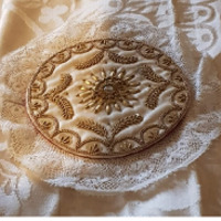 - Palia de forma circular, bordada con fíos de ouro e lentexoula. Na parte central, en calidade de emblema, un sol cunha pedra transparente no medio.