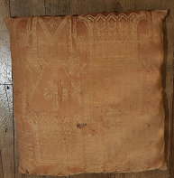 - Coxín con recheo de lá, funda de seda en tea granate e ocre con motivos xeométricos, flores de lis e heráldicos.