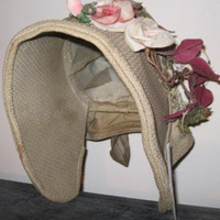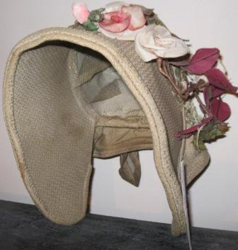 - Sombreiro feminino tipo capota en tea ocre con adornos florais (non son complemento orixinal do chapeu) na parte traseira e un lazo.