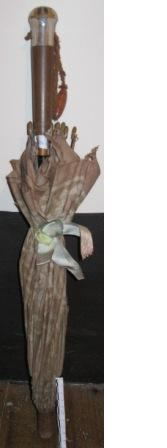 - Antuca de nove variñas e nove panos. Puño en madeira, tea marrón e beixe nun algodón moi deteriorado.