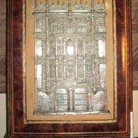 Baixorrelevo do taller madrileño de Arnillas y Matallana, da primeira época, de metal bañado en prata coa imaxe da fachada de Universidade de Salamanca; marco en pel con cenefas en ouro. Apoiado nunha peaña de madeira do seéculo XIX, policromada en verde e roxo.