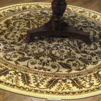 - Alfombra de lá circular de fondo beixe e motivos florais en marrón.