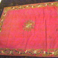- Tapete en seda natural de cor granate con cenefa bordada en fíos dourados intercalados cunha grilanda de flores.