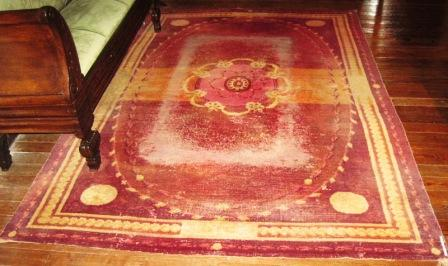 - Alfombra en lá decorada cun óvalo central formado por motivos florais e emblema central de grinaldas en tons granates e ocres.