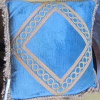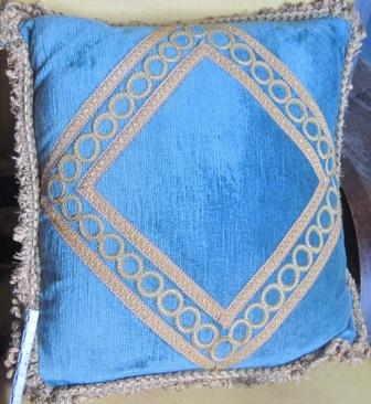 - Coxín en veludo pranchado de cor azul turquesa, e adornos en pasamanería dourada.