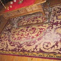 - Alfombra en lá con fondo granate e motivos vexetais en tonos ocres.