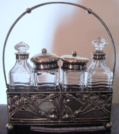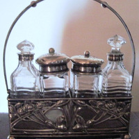 - Comboio con asa en prata repuxada cos seus respectivos recipientes para vinagre, aceite, sal e pementa, en cristal. Coa inequívoca decoración modernista de ramallete de flores, a modo de friso, nas caras frontais e laterais. Da casa alemá Seybold & Hirschauer. Leva selo e contraste (800 DRGM) o que axusta a cronoloxía aos anos 10.