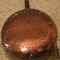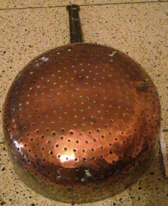 - Molde para o queixo fresco en cobre co mango en ferro, forma circular con buracos.