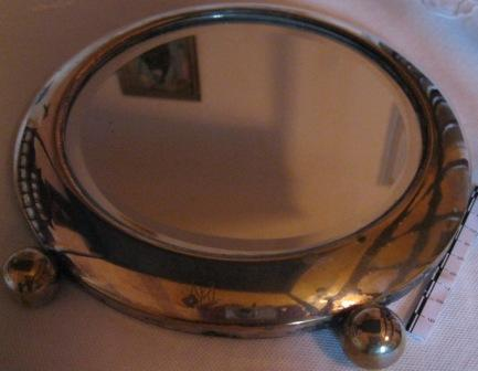 - Espello de toucador en metal bañado en prata e espello en cristal biselado de forma circular coas iniciais "M.M"(Mª Paz e Miguel Ángel), apoiado en dous pequenos pés en forma de bola.