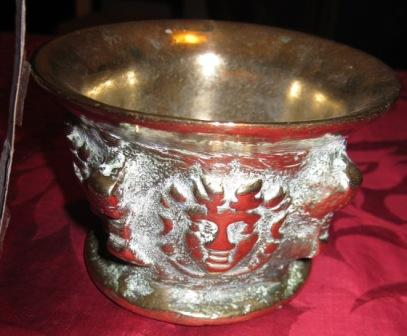 - Morteiro en bronce de boca exvasada de perfil convexo e corpo troncocónico invertido decorado con metopado de mascaróns de gusto manierista separados con sereas en resalte. Non conserva a man.