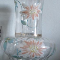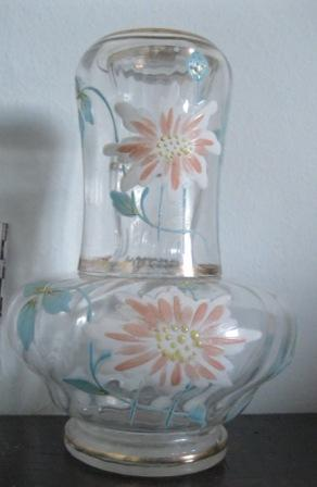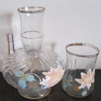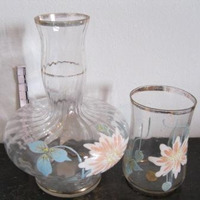 - Botella con vaso en cristal a xogo (un verdó) pintado con motivos florais e filete dourado. A botella, moi panzuda, ten un colo estreito e alongado.