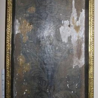 - Caixa en madeira policromada con motivos vexetais en tons negros e dourados que nacen dunha peaña tallada en madeira; o borde da parte frontal en pan de ouro.