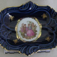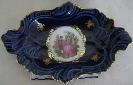 - Bandexa ou despoxador en porcelana de Limoges de fondo azul cobalto, relevo en dourado con motivos florais. Escena central de cortexo.