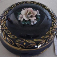 - Caixa para gardar os pós en porcelana de fondo azul cobalto, decorada con motivos vexetais en ouro e na parte central da tapa un flor sobreposta.