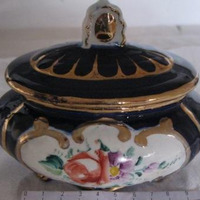 - Caixa de toucador con tapadeira fondo azul cobalto motivos en ouro, e dúas escenas con motivos florais.