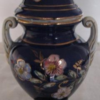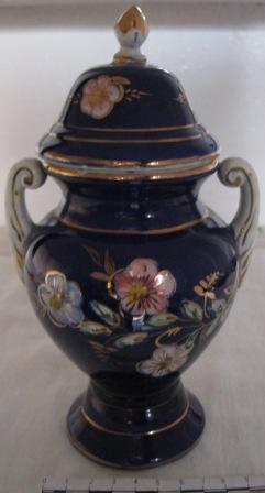 - Vaso en forma de copa con dúas asas e tapa, fondo azul cobalto e decorado con motivos florais dourados.