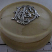 - Caixa circular en plástico beixe e na tapadeira as iniciais en prata "DF"(Dolores Freire).