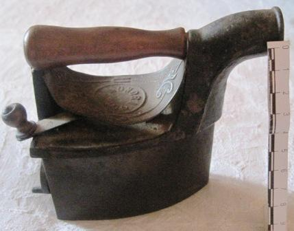 - Ferro de pasar, de carbón, coa asa en madeira, da casa Mondragón, de pequenas dimensións e destinada as ás dos sombreiros.
