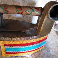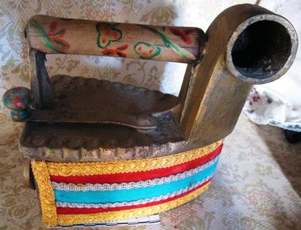 - Ferro de pasar, fundido en ferro, para brasas ou carbón, do nº 9, forrada en veludo vermello e verde e adornos de pasamanería. Puño en madeira decorado con motivos florais. Ten cheminea.