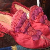 - Conxunto dun par de zapatos femininos pertencentes a Dona Paz de Zúñiga do nº 32 feitos en tea de raso de seda en cor vermello e sola en coiro.
