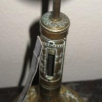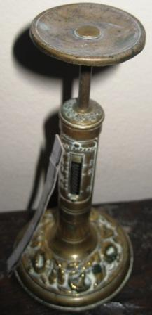 - Báscula de precisión de bronce para pesar moedas de prata e de ouro con decoración floral repuxada no pé. Trátase dun vástago oco, con mola no interior, que nace dun pé exvasado e moldurado, e remata na repisa, plana, onde colocar a moeda.