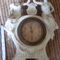 - Reloxo de sobremesa en marmolina. Na parte superior dúas figuras femeninas cunha lira na parte central, reminiscentes do estilo Imperio.