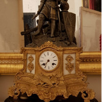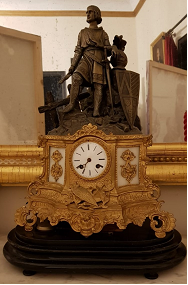 - Reloxo de sobremesa estilo Luis XVI en bronce dourado e mármore. Na parte superior a figura dun cabaleiro, probabelmente Xoana de Arco.