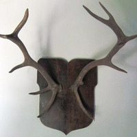 - Panoplia en madeira en forma de escudo que suxeita dous cornos de cervo, de seis puntas cada un.