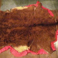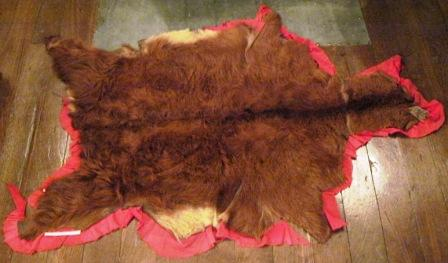 - Alfombra de pel de cabra en tons marróns e ribeteada con tea roxa.