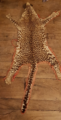 - Alfombra dunha pel de leopardo ribeteada en tea vermella.