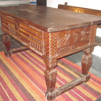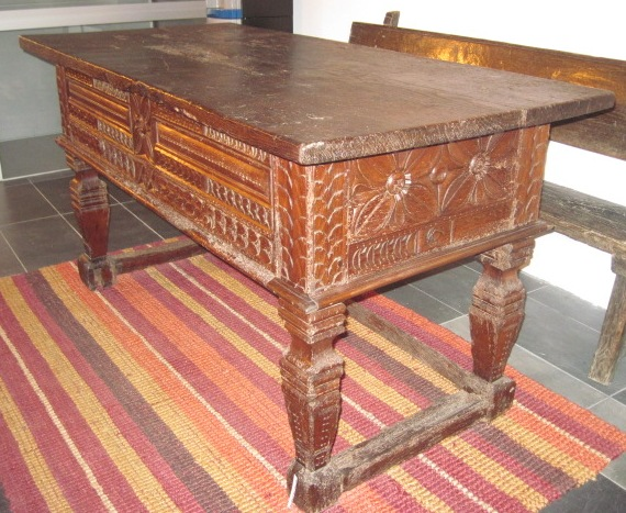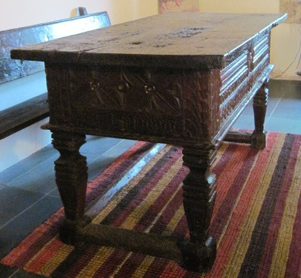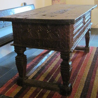 - Mesa labrada en madeira de castiñeiro e ferro, tallada a bisel con debuxos xeométricos e florais (xirasoles, hexapétalas, escamas, trísceles) de carácter apotropaico. Vai erguida sobre catro pés en forma de estípite e tres chambranas. Amplo faldón con dous caixóns. Quizais do oficial de carpentaría Pedro Vastero, pois delata o mesmo estilo que a peza 11 deste inventario.