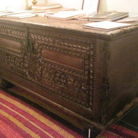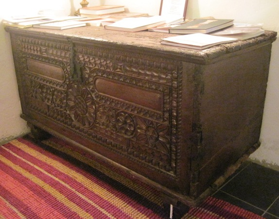 - Arca de gardar en madeira de castiñeiro; consta de catro taboleiros enteirizos ensamblados en cola de miñato e tapa con lixeira moldura, abisagrada, con perno de feche en ferro forzado e bocachabe de cerco avolutado e calado. Conserva a bocachave parte do feltro vermello orixinal. Vai apoiado en zapatas rematadas en pés troncopiramidais. A face frontal vai tallada con motivos florais e xeométricos (xirasoles, hexapétalas, escamas, trísceles) profilácticos e dous cartuchos de lados curvos e perfil convexo cunha inscrición laudatoria adicada a Xesús e María e a firma do autor, Pedro Vastero (sic), e data.