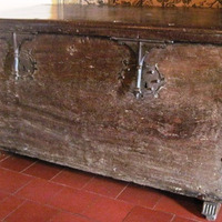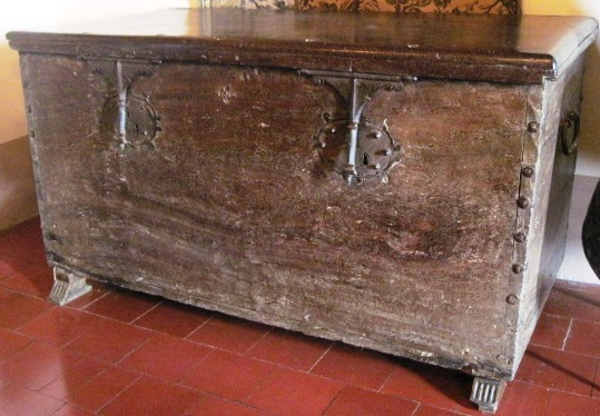 - Arca de madeira tropical cos taboleiros lateirais enteirizos, dunha soa peza, apoiado en catro pés troncopiramidais coa súa cara frontal estriada. O moble conta con dúas pechaduras de ferro na fachada. Os pernos de feche parten da tapa. Nos flancos, asas fundidas en ferro.