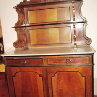 - Aparador en madeira de nogueira con dúas lacenas na parte baixa, dobre caixoneira e repisa en mármore branco. A parte superior, que é retranqueada en planta e está flanqueada por aletóns recortados, a modo de retablo barroco, conta con dúas estanterías. Remata nun tímpano partido e recortado centrado por un copete de froitas talladas, acios, uvas e marmelos.