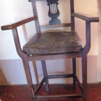 - Cadeira trona con brazos en madeira, respaldo decorado cunha lira ao estilo Imperio e coxín en coiro.