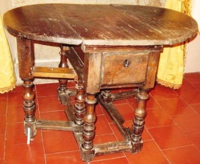 - Mesa encartable de centro en madeira de castiñeiro con dúas ás pregables e dous caixóns laterais (un a cada lado) e oito patas en madeira torneada e aneis lenticulares (dúas delas abatibles).
